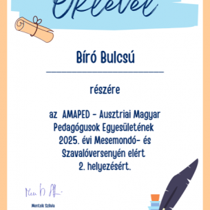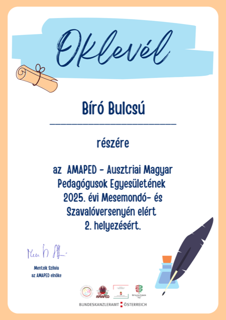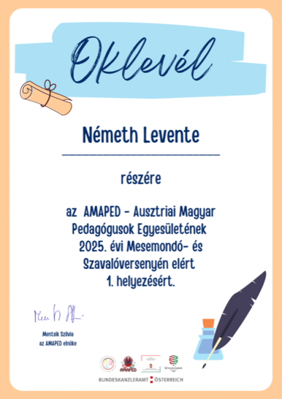 Az AMAPED – Ausztriai Magyar Pedagógusok Egyesülete – által meghirdetett nemzetközi szavaló- és mesemondóversenyen diákjaink kimagasló eredményeket értek el. A 362 vers- és prózamondó közül Németh Levente kategóriájában az első, míg Bíró Bulcsú a második helyet szerezte meg.
