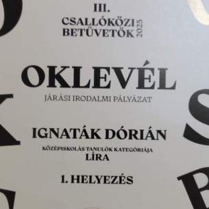 Ignaták Dorián, 1.A/F osztályos tanuló részt vett a Csallóközi Betűvetők nevű járási irodalmi pályázaton, ahol líra kategóriában 1. helyezést, próza kategóriában 2. helyezést sikerült elérnie. Köszönet Néma Ivana tanárnőnek a felkészítésért, Doriánnak pedig a továbbiakban sok sikert kívánunk.