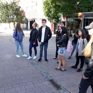 Sétájuk az iskolából indult a város történelméről szóló előadás meghallgatása után, amit az egyik diák készített el és adott elő. Az első célállomás a Csaplár Benedek Városi Művelődési Központ volt és a zenélő szökőkút. Ezt követte az evangélikus templom, Vámbéry tér, Szent György-templom, ahova lehetőség volt bemenni és körülnézni is. Városnéző sétájuk során több emlékművet is láttak, hallgatván történetüket. Folytatták útjukat a Vermes villába, a Hadifogoly temetőbe, elhaladván a zsidó temető mellett.