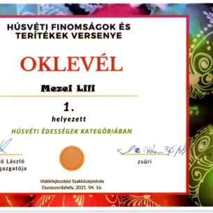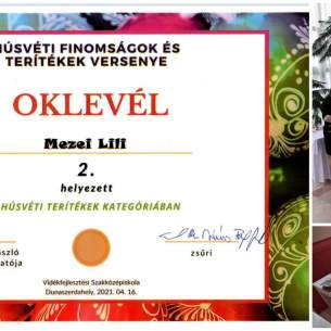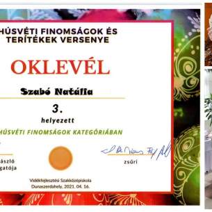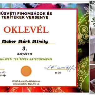 Nagy örömünkre szolgált, hogy a húsvét alkalmából megrendezett gasztronómiai versenyt már nem online formában, hanem az iskola épületében, diákjaink jelenlétében tudtuk kiértékelni. A versenyzők eredetileg két kategóriában nevezhettek, de annyi nagyszerű pályamunka érkezett be, hogy a zsűri végül három kategóriába sorolta a konyhaművészeti alkotásokat: teríték, finomság (étel), édességek (desszert). Kategóriánként három helyezett kapott díjat, továbbá az iskola facebook-oldalán legtöbb lájkot kapott versenyzők pedig különdíjban részesültek.