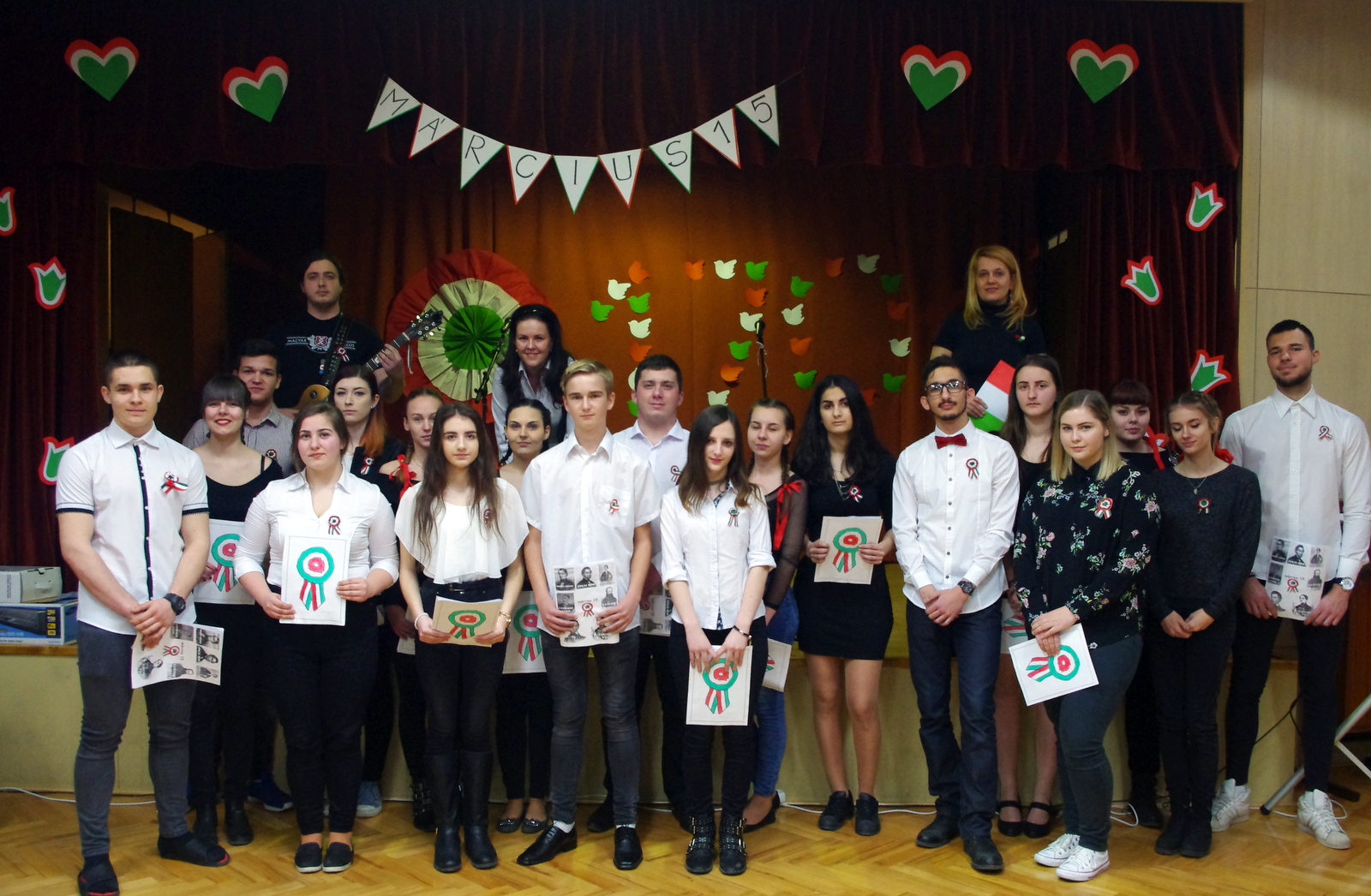 Szabadság, szerelem címmel zenés-irodalmi műsort tartottak iskolánkdiákjai március 15-én.A márciusi forradalom 170. évfordulójának tiszteletére összeállított programban azokról a fogalmakról emlékeztek meg dalban és versben, amelyek mára már szinte összeforrtak legnagyobb nemzeti ünnepünkkel. Szó volt a 12 pontról, a Pilvax Kávéházról, a Nemzeti Múzeumról és természetesen a Nemzeti dalról is. A forradalmárok mellett azokról is szóltak, akik 1848 főszereplőit a háttérből támogatták, akik olykor maguk is fegyvert ragadtak, sebesülteket ápoltak, menekülteket bújtattak vagy éppen csak csendesen szeretteikért aggódtak. Ők voltak a márciusi ifjak szerelmei, lánytestvérei, többek közt Szendrey Júlia, Laborfalvi Róza, Damjanichné Csernovics Emília, ill. Kossuth Zsuzsa és Teleki Blanka.Bár a forradalom mozzanatait a diákság úgy ismeri már, mint a bibliai történeteket, Nyáry Krisztián frissen megjelent Fölébredett a föld című könyvéből és annak promóciós videóiból sikerült olyan újdonságokat bemutatni, amelyek eddig még nem voltak ismeretesek.Az ünnepi műsort az iskola tehetséges énekesei és zenészei a legismertebb forradalmi dalok előadásával, tánccsoportja pedig piros-fehér-zöld koreográfiájával tette még emelkedettebbé. A megemlékezés videóanyagát egyrészt a Red Bull Pilvaker projekt tavalyi előadásának részletei, másrészt pedig felvidéki előadóművészek (Vadkerti Imre, Ghymes, Szvorák Katalin) produkciói képezték. A felkészítő tanárok, Nagy Zsuzsanna és Kis Lívia szabadságköszöntő gondolataival és a Himnusz eléneklésével zárult az idei ünnepi rendezvény.