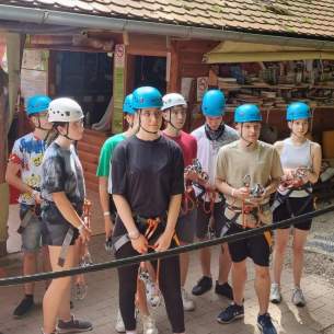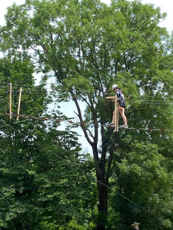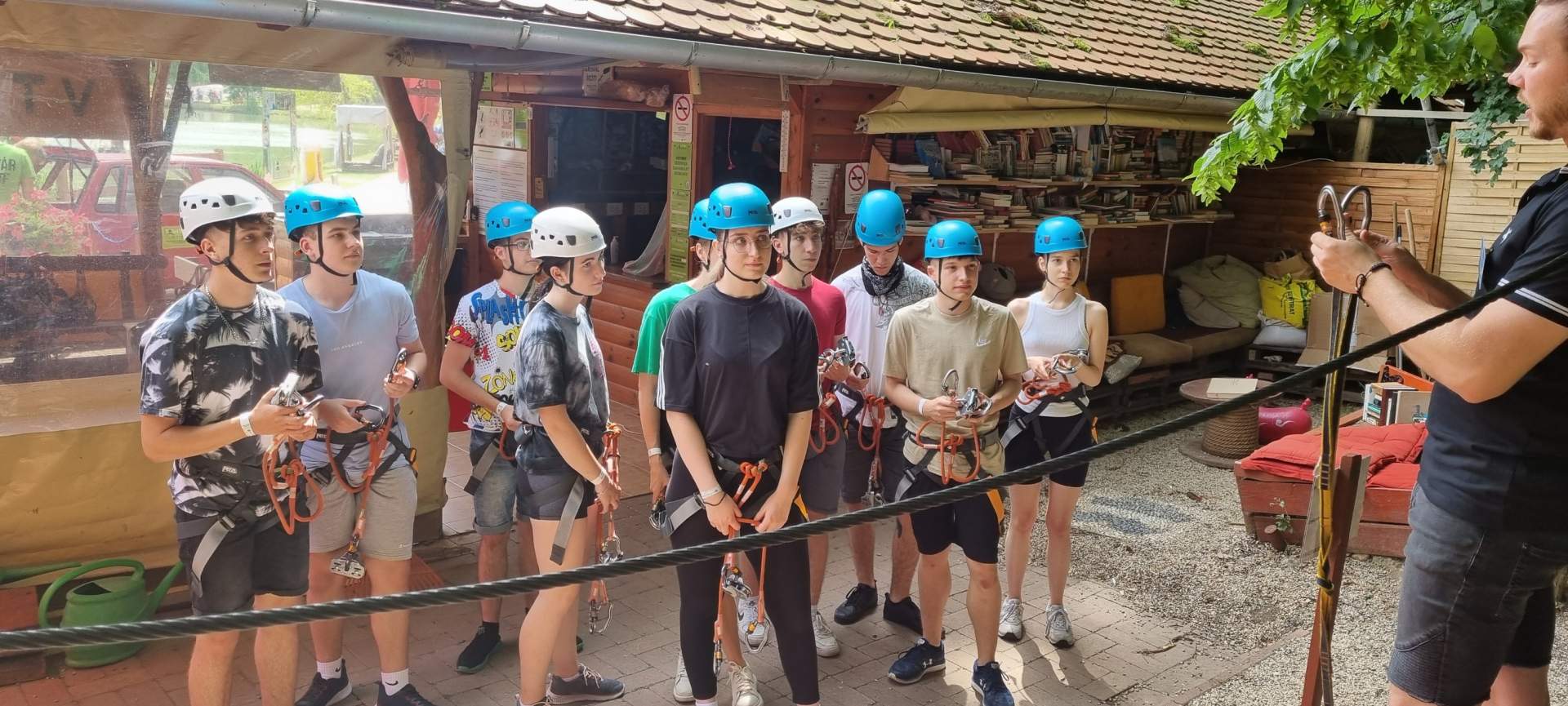 Legelső utunk a drótkötélpályához vezetett, ahol megkaptuk a megfelelő felszerelést és neki is indulhattunk a mászásnak. A fiúk nagyrésze a felénél abbahagyta, arra hivatkozva, hogy túl magas és nehéz volt, miközben mi lányok végig vittük a pályát. A kedvencünk a tó fölötti átcsúszás volt.