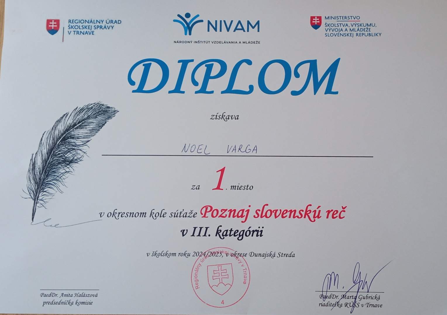 2025. március 25-én a Vidékfejlesztési Szakközépiskola diákja Modzga Júlia a III.A/FJK osztályból, valamint Varga Noel a Középfokú Sportiskola III. SM osztályából képviselték iskolánkat a „Poznaj slovenskú reč“ verseny járási fordulóján.