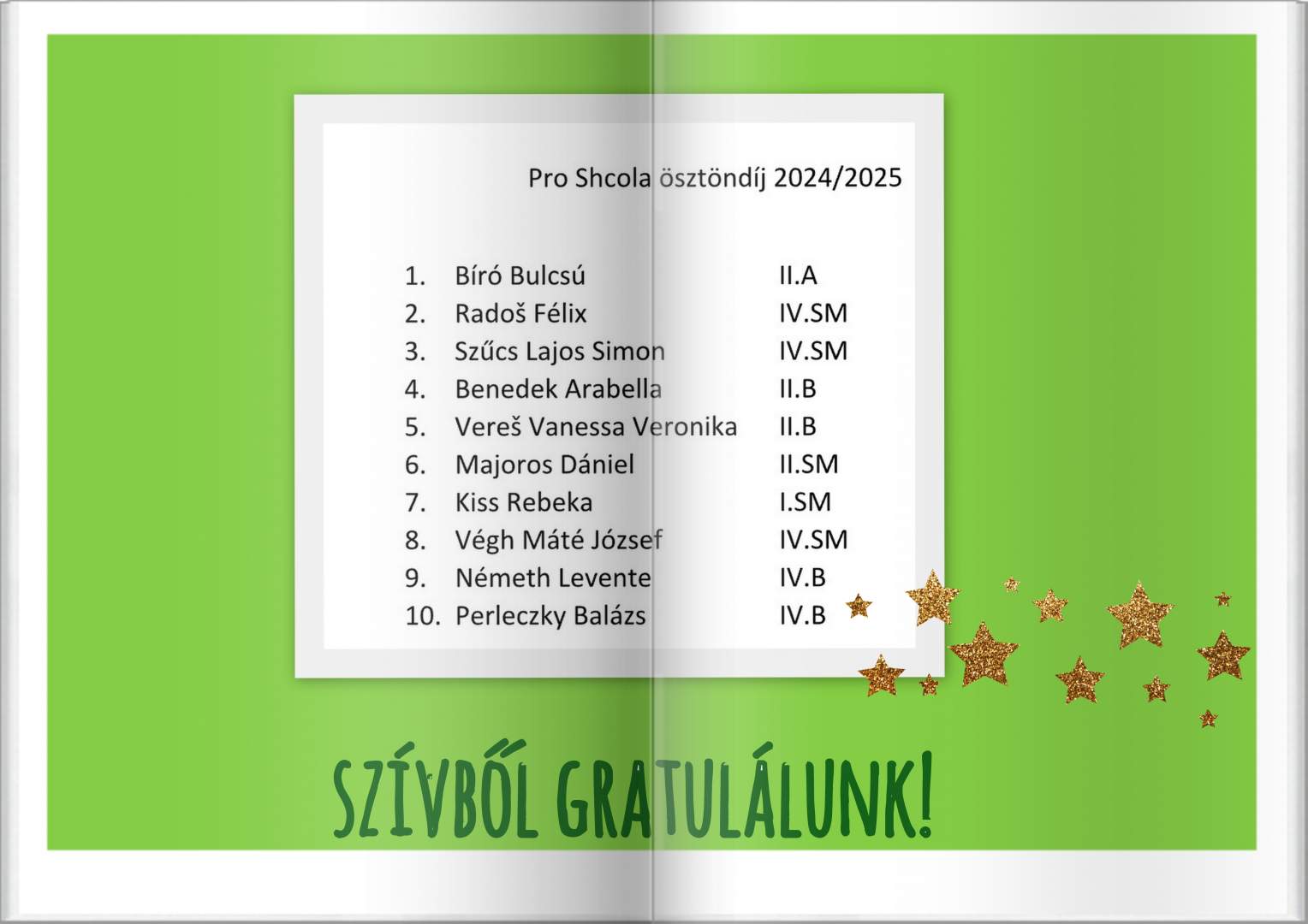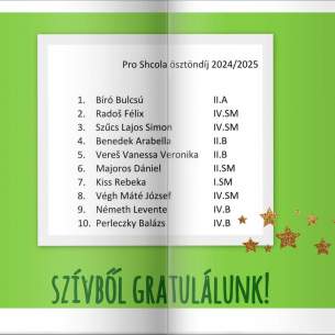 A 2024/2025-ös tanévben ismét tíz diák részesült a 100 eurós ösztöndíjban. Szívből gratulálunk minden díjazottnak, és további sikereket, kitartó szorgalmat és töretlen lelkesedést kívánunk nekik!