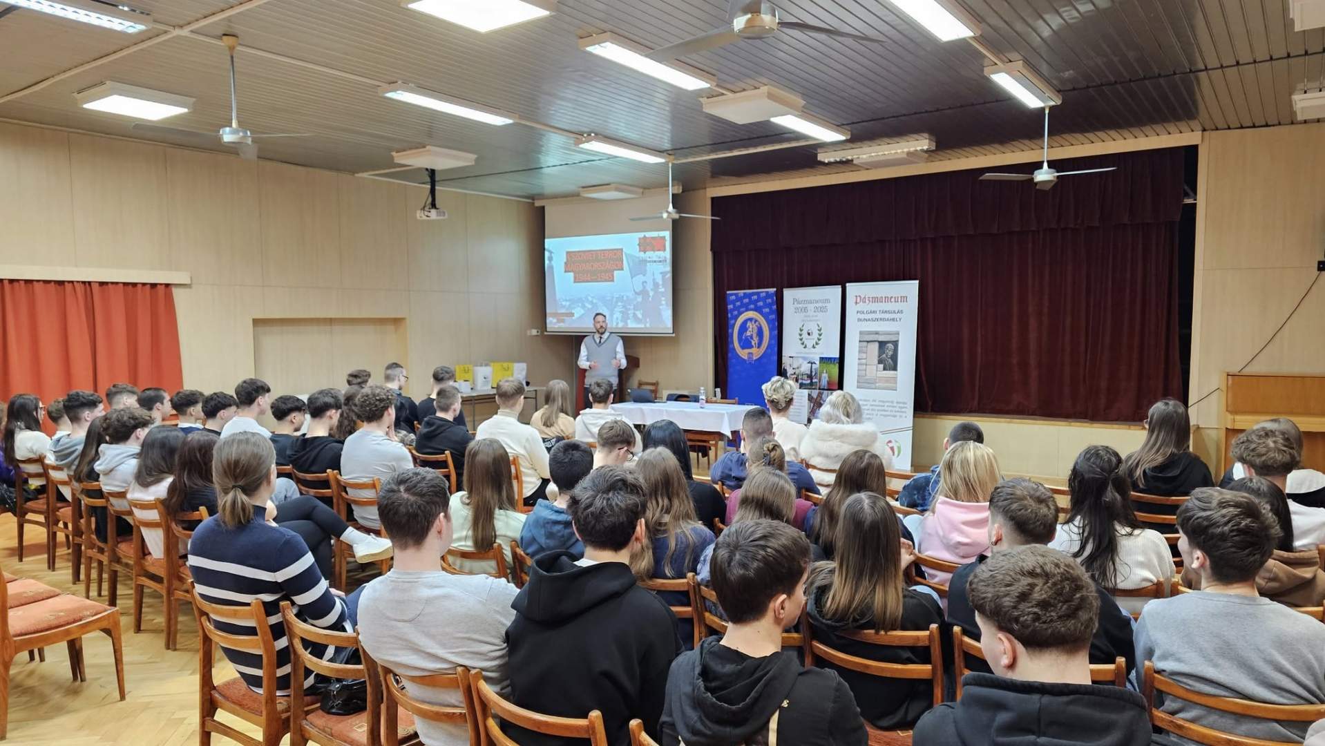 A diákság feszült figyelemmel hallgatta Farkas Sebestyén Lőrinc, a budapesti Terror Háza Múzeum történészének a „Szovjet terror Magyarországon 1944–1945” című előadását.