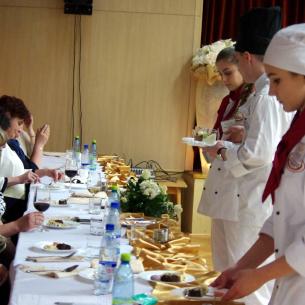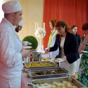 Az abszolvensek munkájuk gyümölcsét a tulajdonképpeni eseményen prezentálták. Tanáraikat gazdagon megrakott asztalokkal ünnepi díszbe öltöztetett teremben várták. Annak ellenére, hogy ez az osztály az elmúlt öt év során már nem egyszer szervezett színvonalas ételbemutatót, a pazar ételkínálat ámulatba ejtett mindenkit. A hidegkonyhai készítmények közül sokan választották a lazacos spenótos roládot, az aszpikos majonézes franciasalátát, a kolbásszal töltött sertéskarajt és a velős pirítóst. A levesek közül a ramen és a brokkolikrémleves egyaránt népszerű volt.