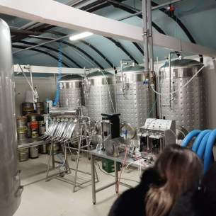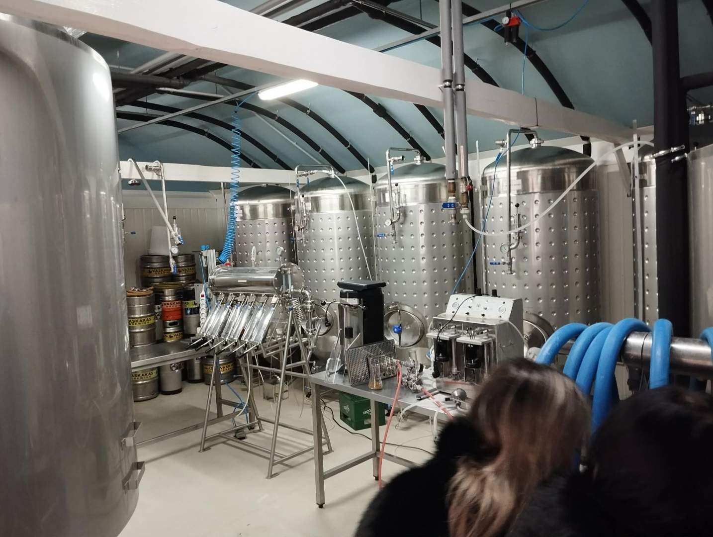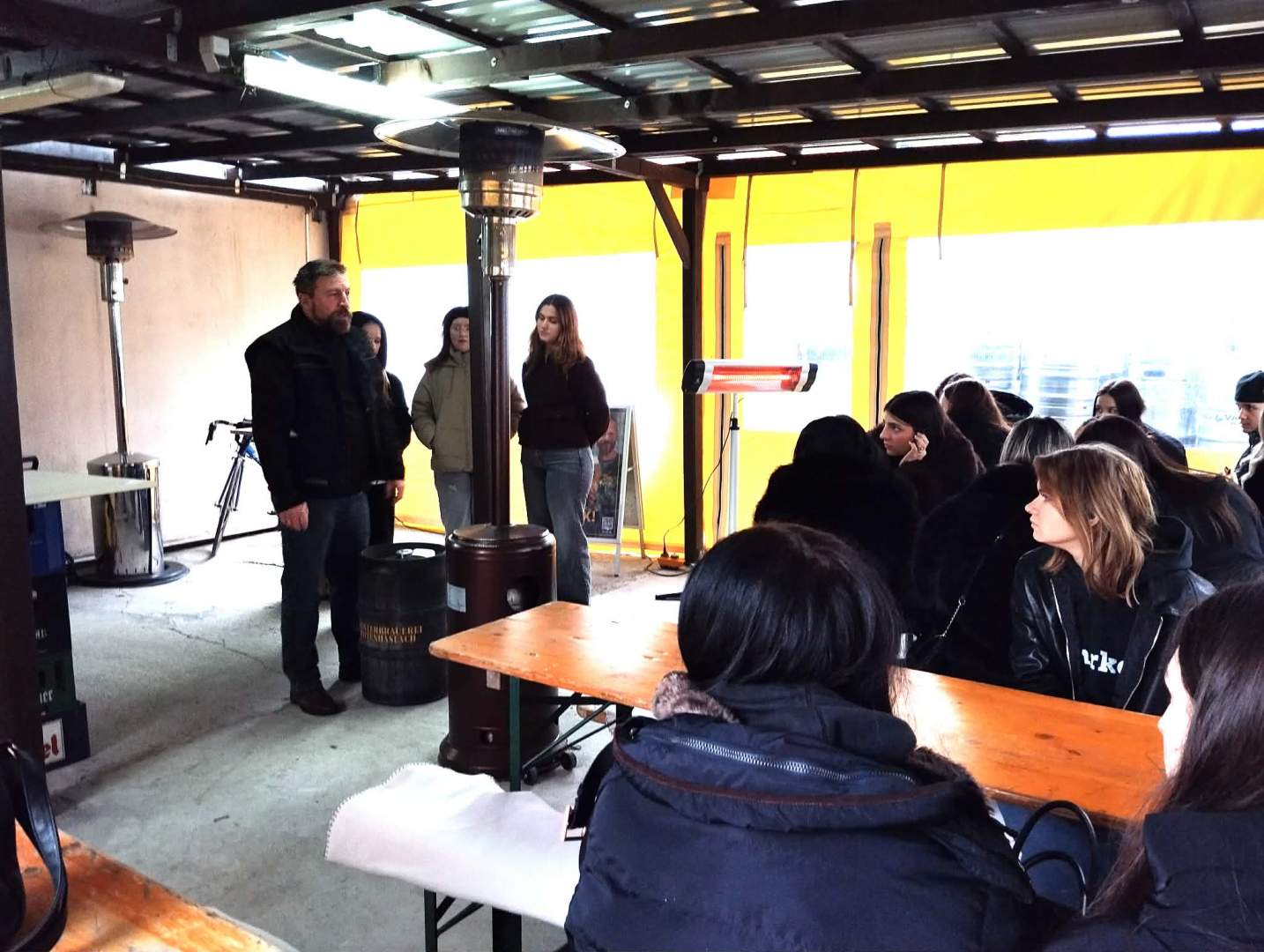 Az első állomás Győrújbaráton volt, ahol a Vaskakas Sörfőzde tulajdonosa személyesen fogadta a csoportot. A tanulók két csoportra bontva vettek részt egy részletes előadáson, amely átfogó képet adott a sörgyártás folyamatáról. Megismerkedtek az alapanyagokkal, a készítés technológiai lépéseivel, a különböző sörtípusok jellemzőivel, valamint a higiéniai előírásokkal és a szakszerű csapolás fortélyaival is.