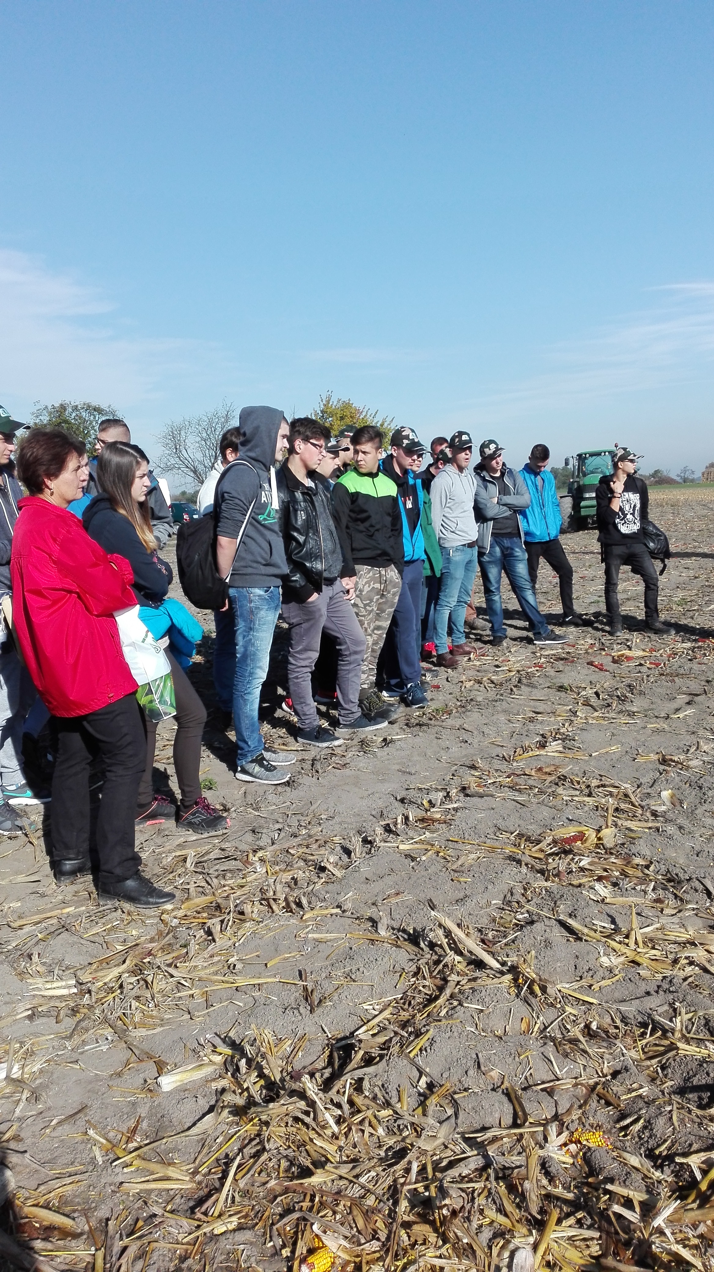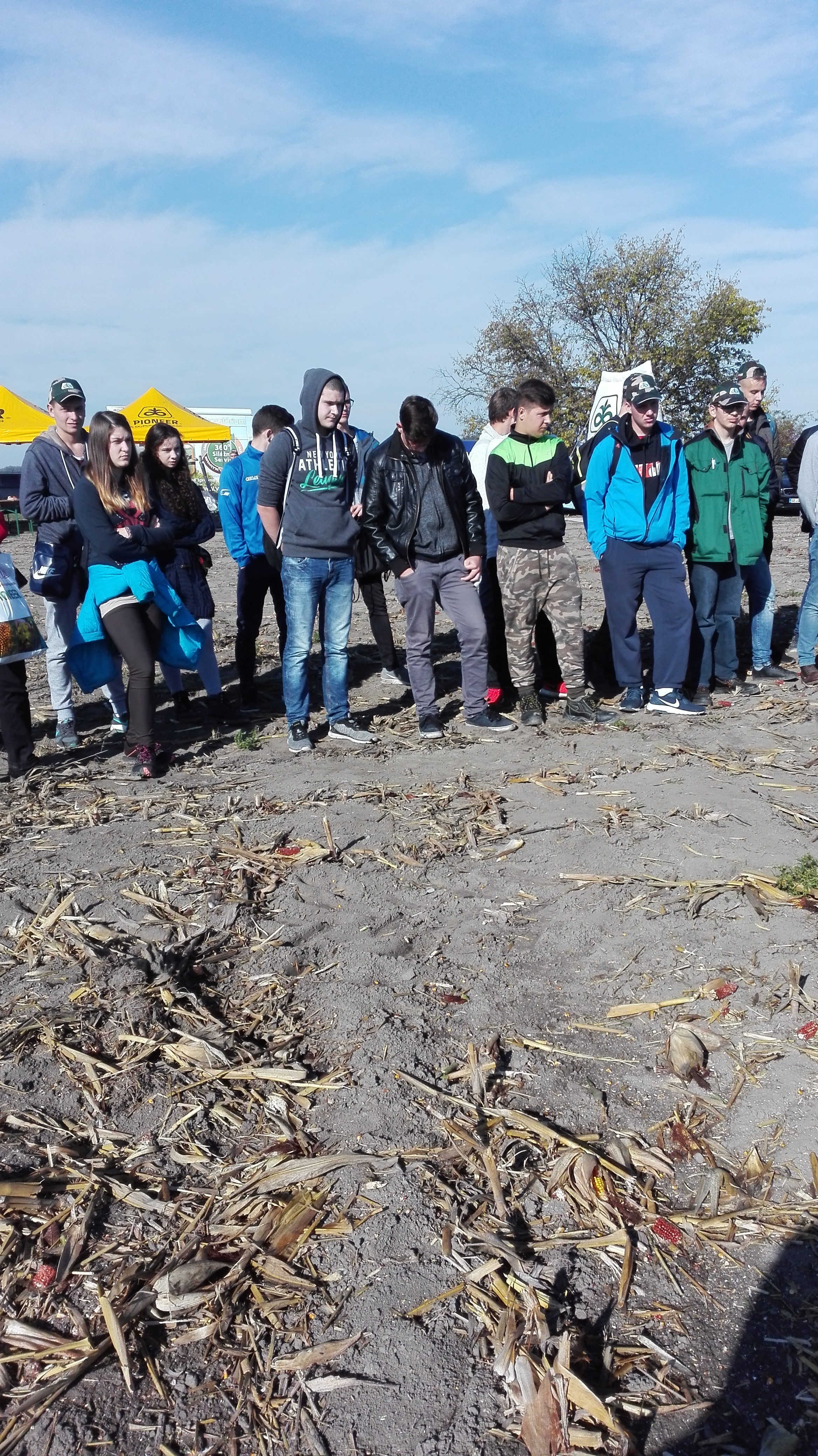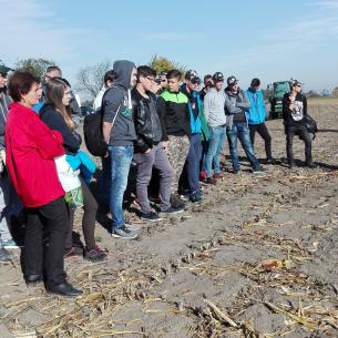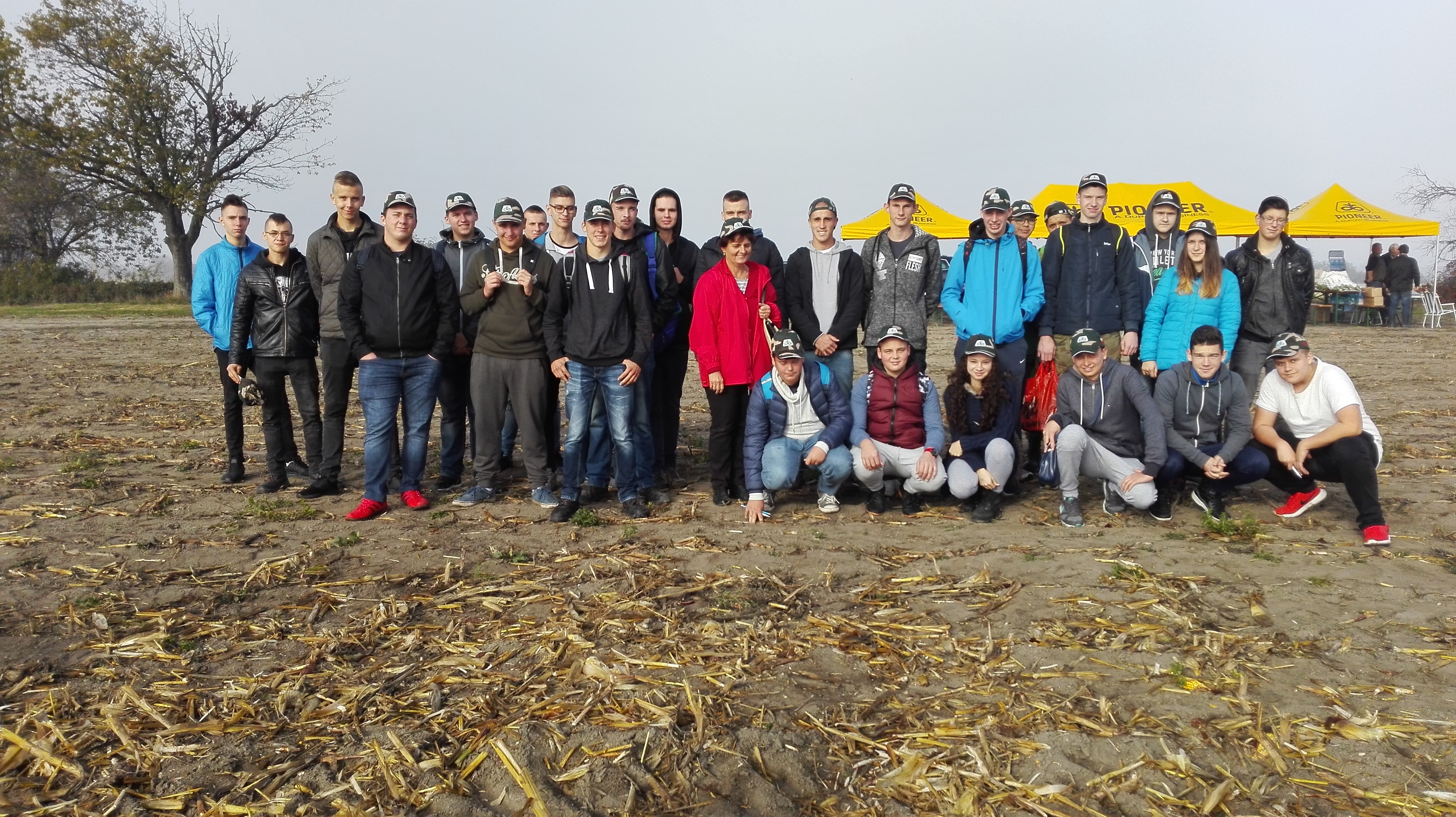 Október 12-én az I.F/A , II.F/A, III.F/A és a IV.F/A osztály tanulói megtekintették a Pioneer kukorica fajtabemutatót a lúcsi szövetkezet parcelláin. Az időjárás is kedvezett a szervezők számára. A tanulók betekintést nyerhettek a gazdálkodás nehézségeibe is, hiszen ez az év rendkívülinek nevezhető az időjárási körülmények miatt. A fajtabemutatót inkább szakmai találkozónak minősítették, hiszen az idei eredmények rendkívül rosszul sikerültek az ágazat számára. A tavalyi hektárhozamokat meg sem közelítették az idei eredmények. Ott, ahol öntözésre nincs lehetőség, a következő évek is nehéznek bizonyulhatnak a termesztők számára. A lúcsi szövetkezet parcelláin az idei évben -131mm csapadékhiány jelentkezett a 2016-os évhez viszonyítva. A szövetkezet légi felvételei is mutatják, hogy a parcella bizonyos részein nulla termés várható a talaj összetételének köszönhetően. A várható klímaváltozás új tulajdonságokkal rendelkező hibrideket igényel. A Pioneer mögött több, mint 50 éves kutatómunka áll. Legfőbb célkitűzése a termelőkkel való élő kapcsolat kialakítása és igazodni a megváltozott körülményekhez. A Pioneer cég képviselői ismertették a kukorica termesztésének kezdeteit, amikor hibrideket még nem termesztettünk, csak vonalakat és maximum 2t hozamaink voltak. Érdekességként megemlítették, hogy ma Amerikában 33t a valaha elért legmagasabb hektárhozam kukoricából. .A bemutatott hibridek az Optimum AQUA max elnevezést kapták, amelyek aszályos viszonyok között is a maximumot tudják nyújtani. Az újabb hibridek jobban elviselik a szárazabb körülményeket, nagyobb ellenálló képességgel rendelkeznek és jobb a vízleadó képességük is. A diákok a fajtabemutató után a betakarítás és a talajmegmunkálás eszközeivel is megismerkedhettek. A szívélyes fogadtatásért köszönet a szövetkezetnek.