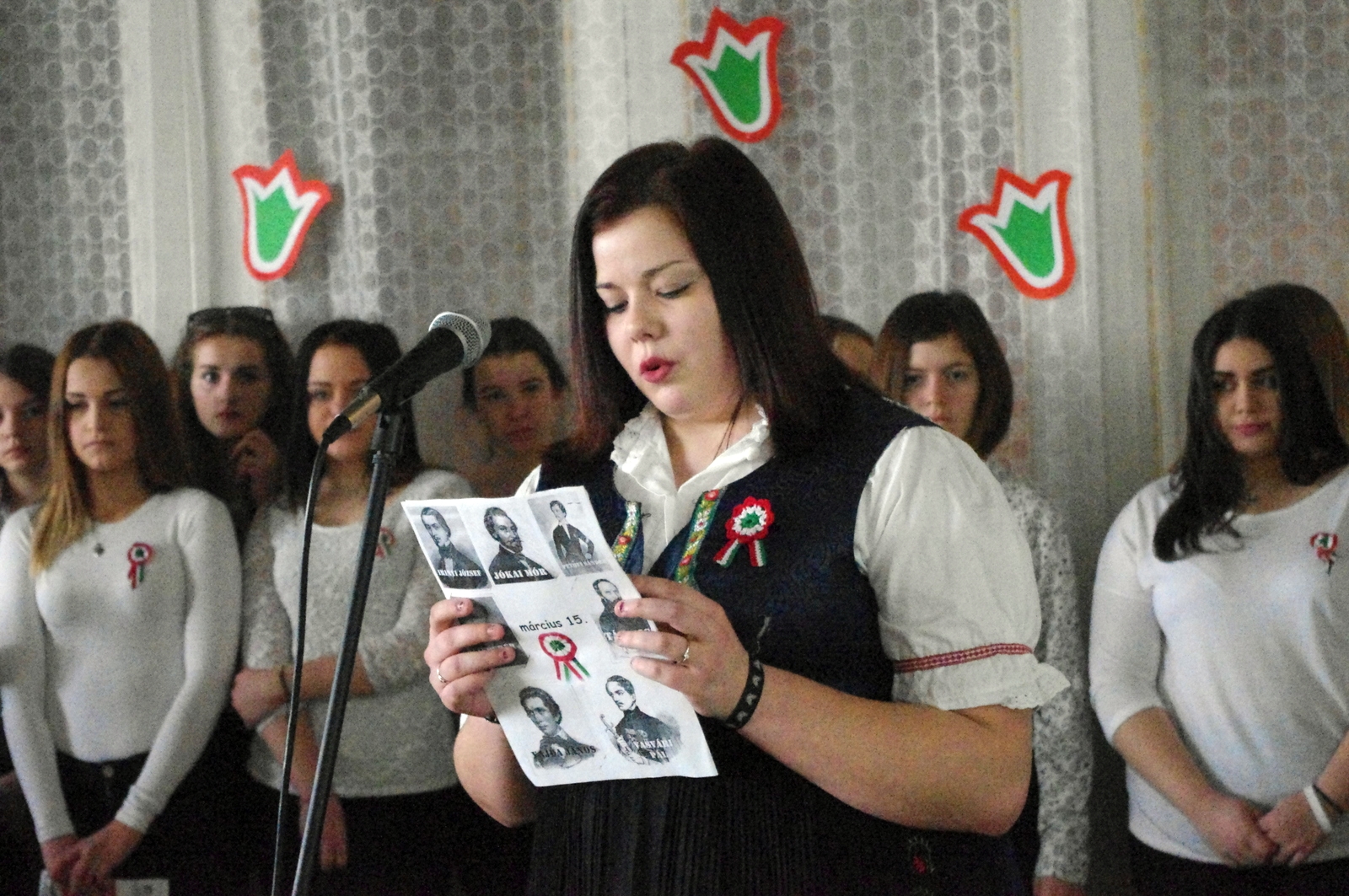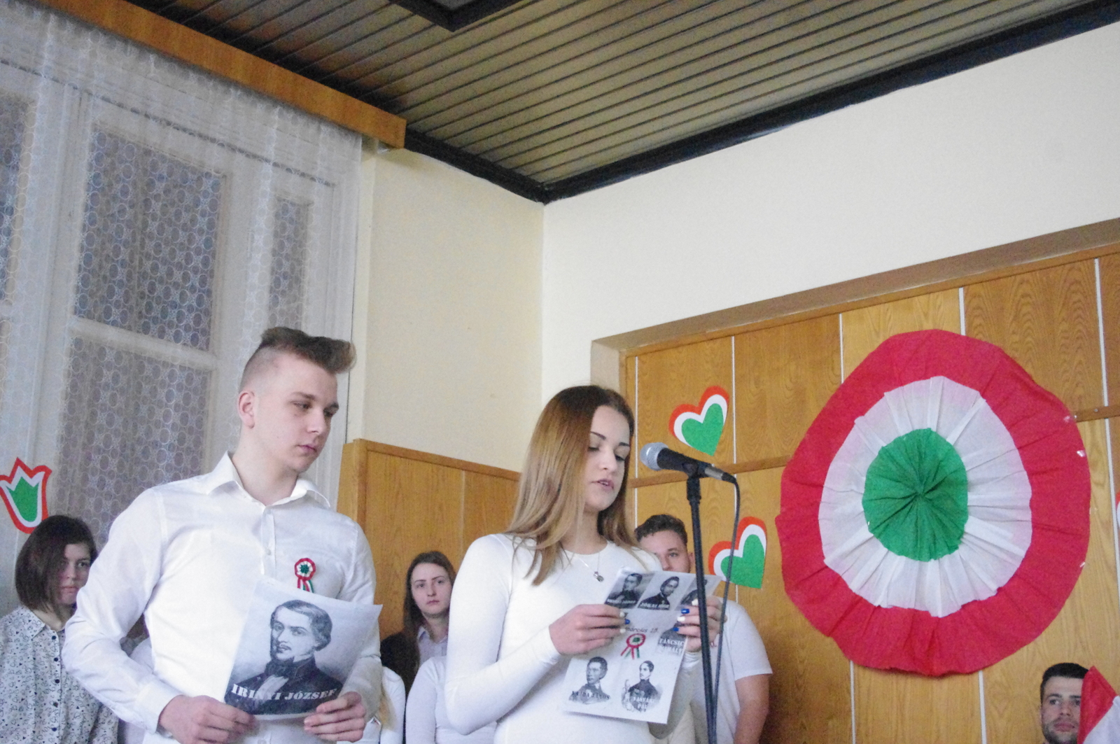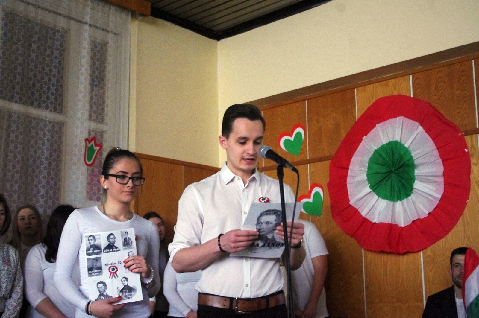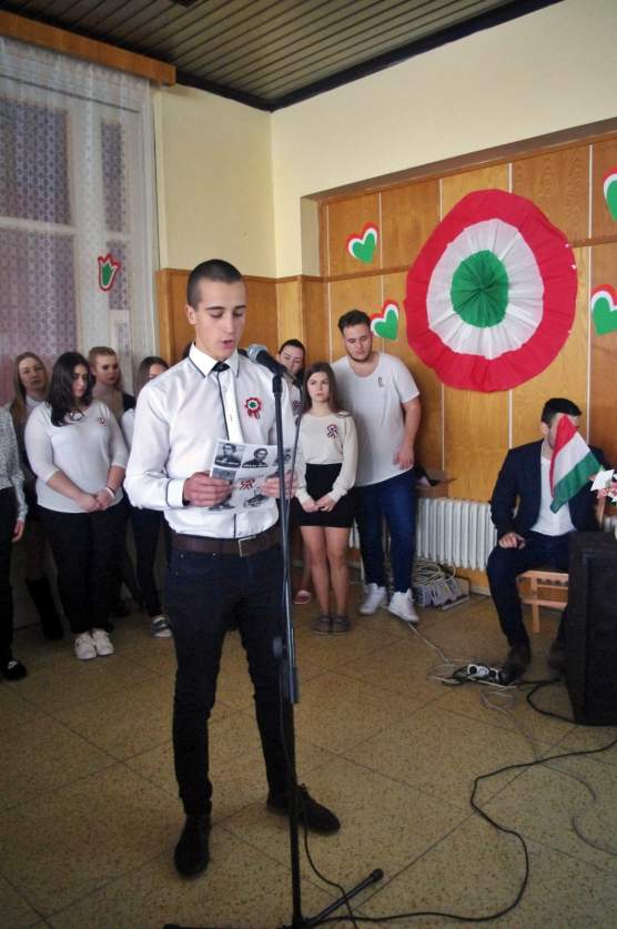 A Petőfi, Vasvári, Irinyi, Vajda, Jókai, Táncsics és Landerer történelmi jelentőségét bizonyító sorokon kívül elhangzottak továbbá a naphoz fűződő versrészletek is, az alkalmi diákkórus tolmácsolásában pedig  felcsendült a híres Kossuth-nóta, a Talpra magyar népzenei változata ill. a Tavaszi szél vizet áraszt című dal is, néptánc kíséretben.