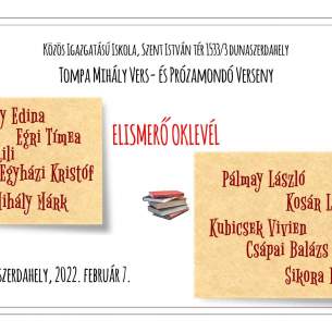 2022. február 7-én került megrendezésre a Tompa Mihály Vers- és Prózamondó Verseny iskolai fordulója. A versenyzők többsége verset mondott, de akadtak olyanok is, akik prózával készültek. A szerzők között akadt klasszikus, kortárs és kisebbségi egyaránt. Az iskola magyartanárai rendkívül örültek, hogy a vészterhes idők ellenére ilyen sok diákot vonzott ez az irodalmi megmérettetés. Iskolánkat a következő tanulók képviselik a járási fordulón: