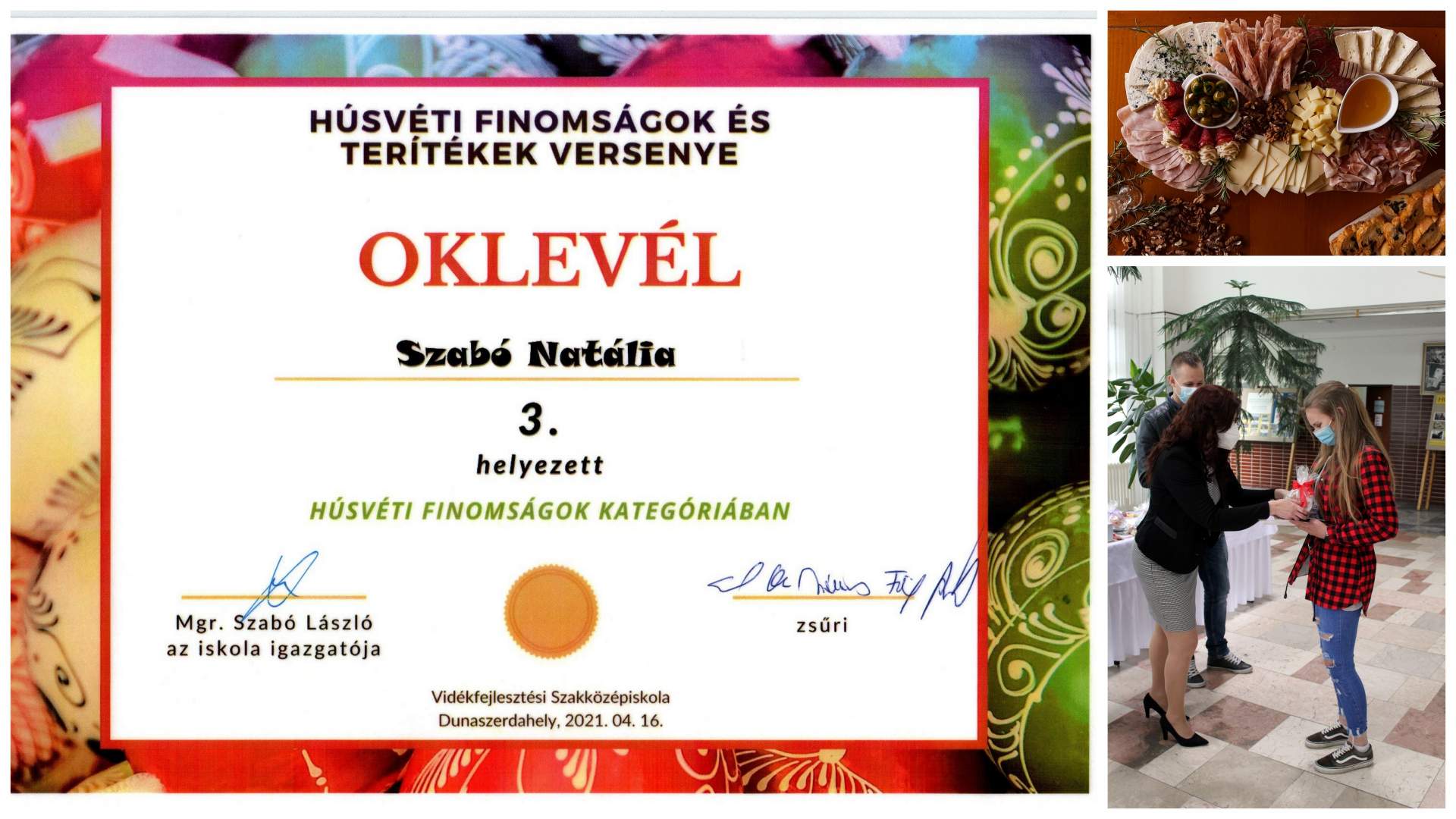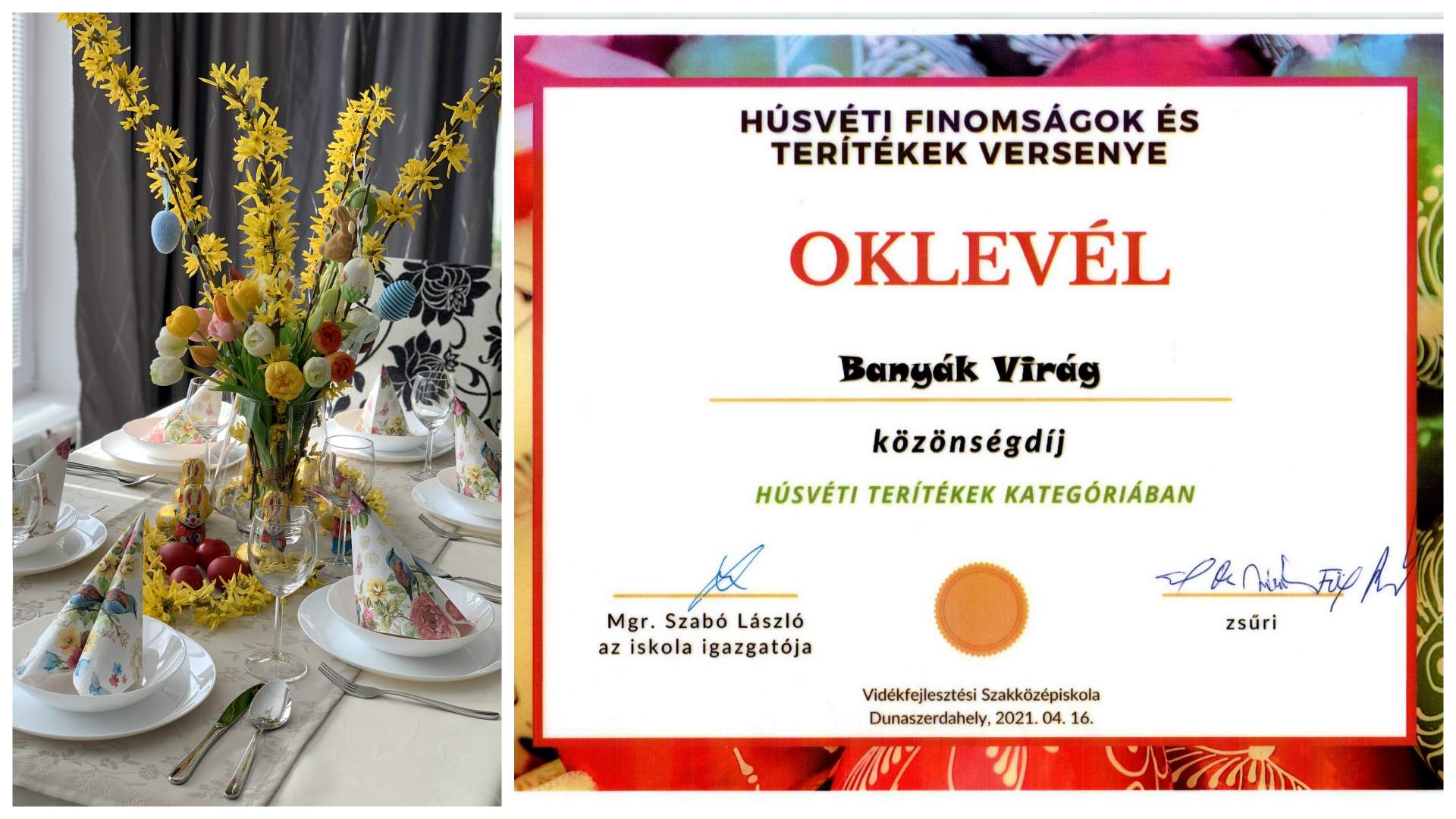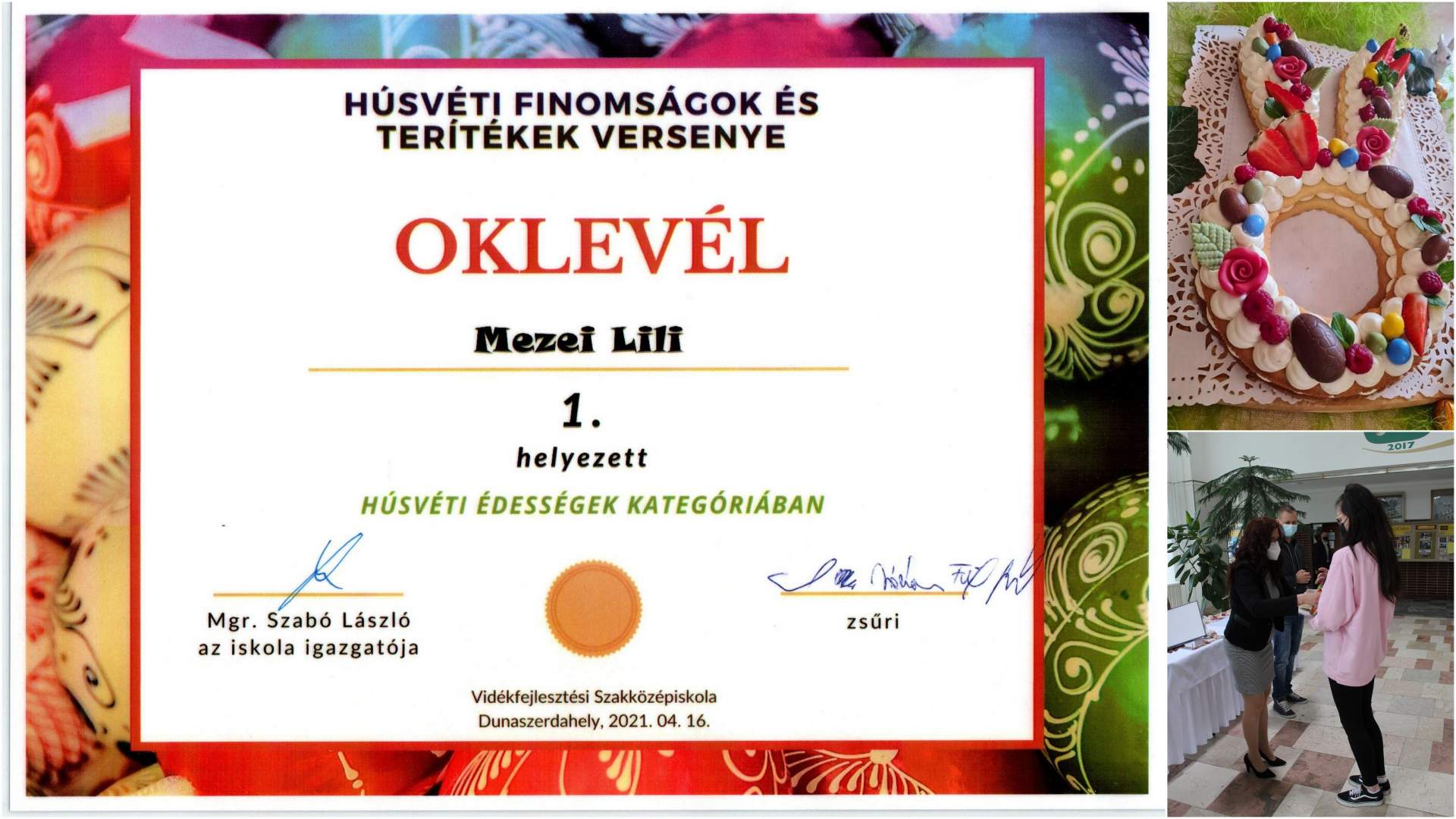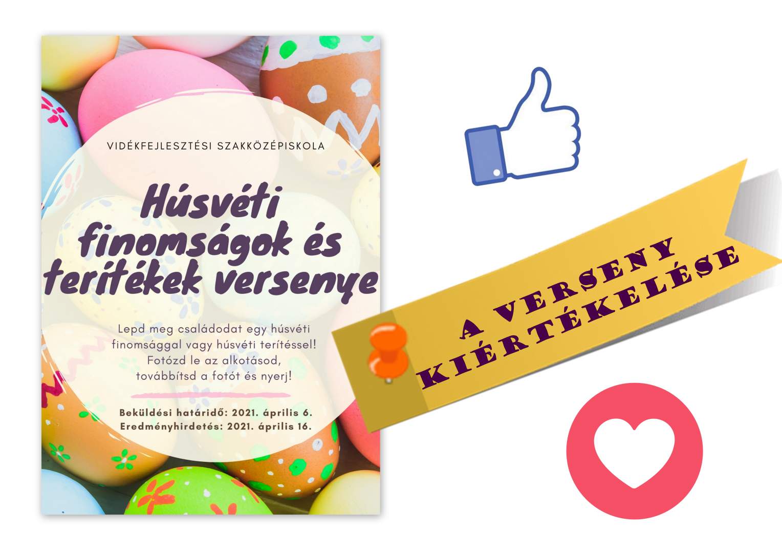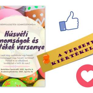 Nagy örömünkre szolgált, hogy a húsvét alkalmából megrendezett gasztronómiai versenyt már nem online formában, hanem az iskola épületében, diákjaink jelenlétében tudtuk kiértékelni. A versenyzők eredetileg két kategóriában nevezhettek, de annyi nagyszerű pályamunka érkezett be, hogy a zsűri végül három kategóriába sorolta a konyhaművészeti alkotásokat: teríték, finomság (étel), édességek (desszert). Kategóriánként három helyezett kapott díjat, továbbá az iskola facebook-oldalán legtöbb lájkot kapott versenyzők pedig különdíjban részesültek.