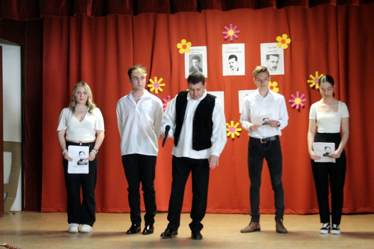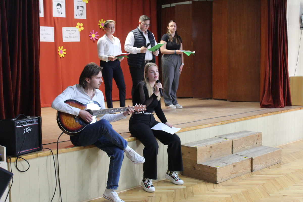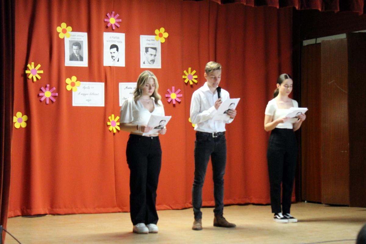 Naplórészletek, versek és életrajzi utalások felolvasásával hívtuk közös gondolkodásra az iskola diákjait. Az öt egységből álló előadás József Attila gyermekkorában átélt traumáit boncolgatta, ifjúkori meg nem értettségét elemezte, szerelmi viszonyait vizsgálta, felnőttkori lelki sérüléseit analizálta és halálának vélhető okait tárta fel. Szó volt a költő csonka családjáról, verbális és tettleges bántalmazásáról, szeretetéhségéről és nélkülözéséről. Az egyes részeket versekkel, megzenésített költeményekkel, ill. táncbetéttel egészítették ki. Az olykor megrendítő életrajzi vonatkozásokhoz a kivetítő táblán néhány segítő tanács, útmutató gondolat volt olvasható. Mivel az esemény céljának az elfogadásról való közös töprengést tűztük ki, kézenfekvő volt, hogy vendégelőadóként a Mentális Sérülteket Segítő Társulás tagjait hívtuk meg. Az iskola eddig is szoros kapcsolatot ápolt velük, számos érzékenyítő diákprogramban vettek már részt, legutóbb a jótékonysági sütivásárból befolyt összeget ajánlottuk fel nekik. Érzelemgazdag előadásmódjukat, szeretettelteli fellépésüket vastapssal jutalmazta a közönség. Az inspiráló gondolatokat, szuggesztív verseket, mélyreható üzeneteket tartalmazó műsort a fogyatékkal élők egyik lelkes szavalója zárta: