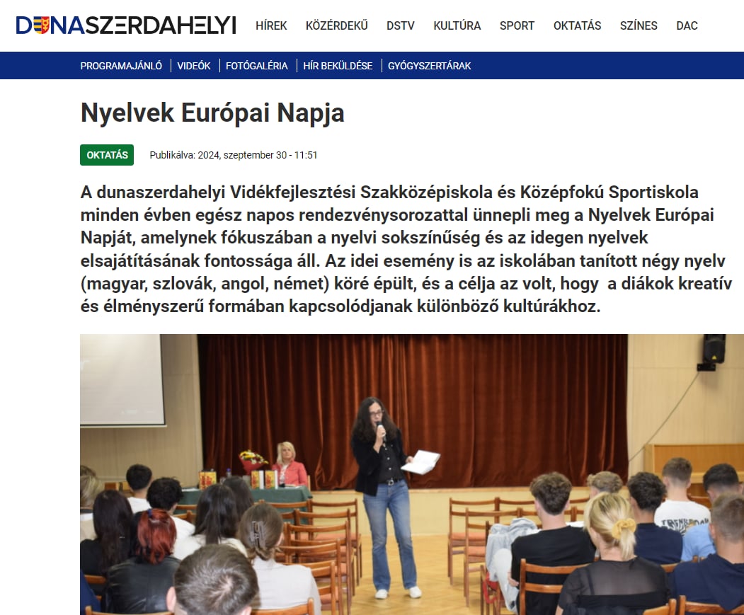 A dunaszerdahelyi Vidékfejlesztési Szakközépiskola és Középfokú Sportiskola minden évben egész napos rendezvénysorozattal ünnepli meg a Nyelvek Európai Napját, amelynek fókuszában a nyelvi sokszínűség és az idegen nyelvek elsajátításának fontossága áll. Az idei esemény is az iskolában tanított négy nyelv (magyar, szlovák, angol, német) köré épült, és a célja az volt, hogy a diákok kreatív és élményszerű formában kapcsolódjanak különböző kultúrákhoz.