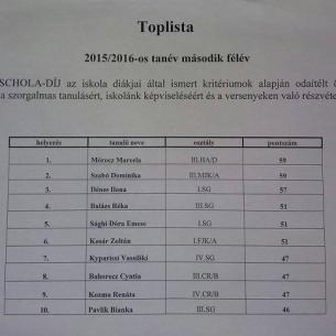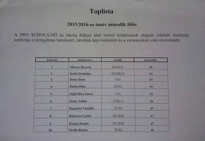 A Pro Schola díj az iskola diákjai által ismert kritériumok alapján odaítélt ösztöndíj a 2015/2016-os évben.