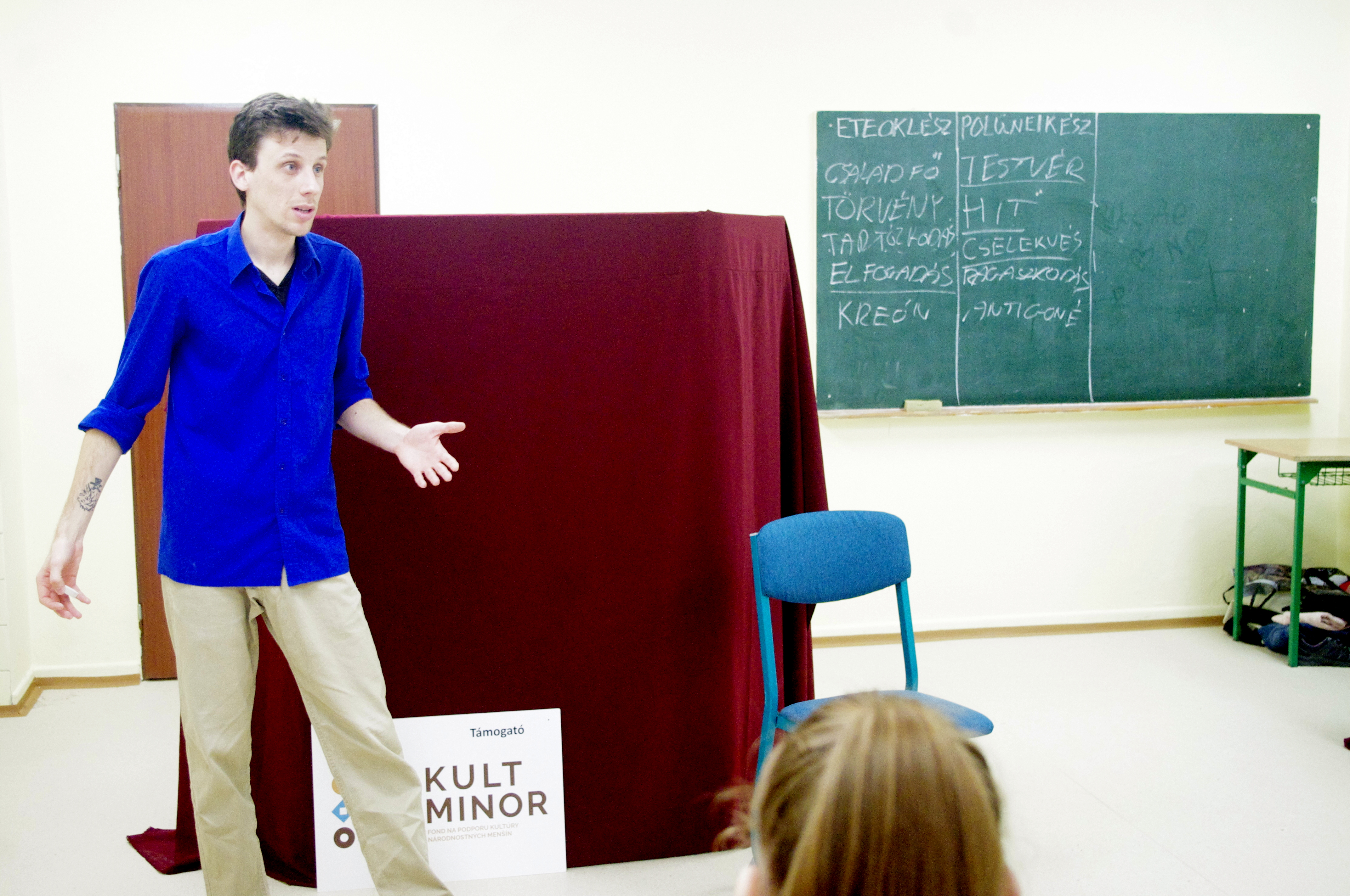 2018. december 18-án ismét nálunk járt a Rivalda Színház. Ezúttal Szophoklész Antigoné című drámájába nyertünk "beavatást". Bár tragédiáról van szó, az előadás alatt volt móka, kacagás, szavazás. Diákjaink több esetben aktív részesei voltak a produkciónak, a darab végén pedig véleményt formálva érvelhettek a bukott hős ellen ill. mellett. Köszönjük az egyedülállóan izgalmas színházi élményt a Rivalda Színház társulatának.