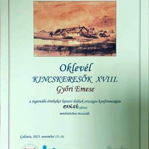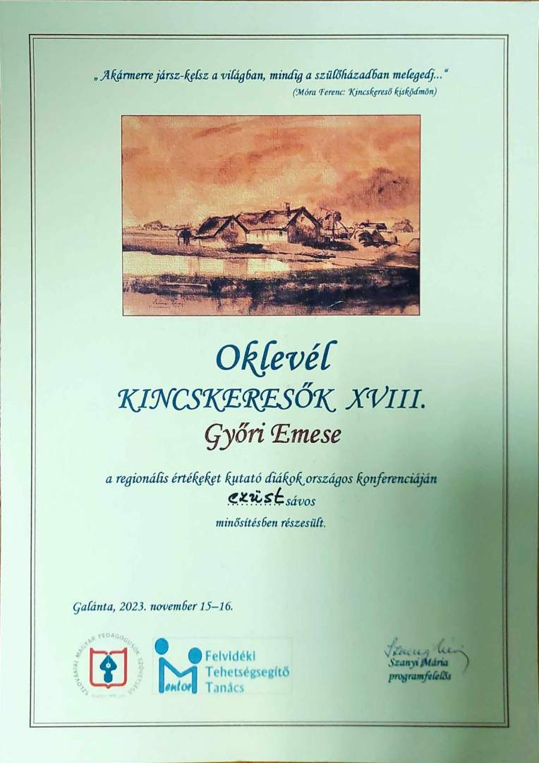 Emese Győri, študentka I.HA triedy získala strieborný pás na národnej konferencii Hľadačov pokladov - študentov skúmajúcich miestne hodnoty. Venovala sa historickým pamiatkam