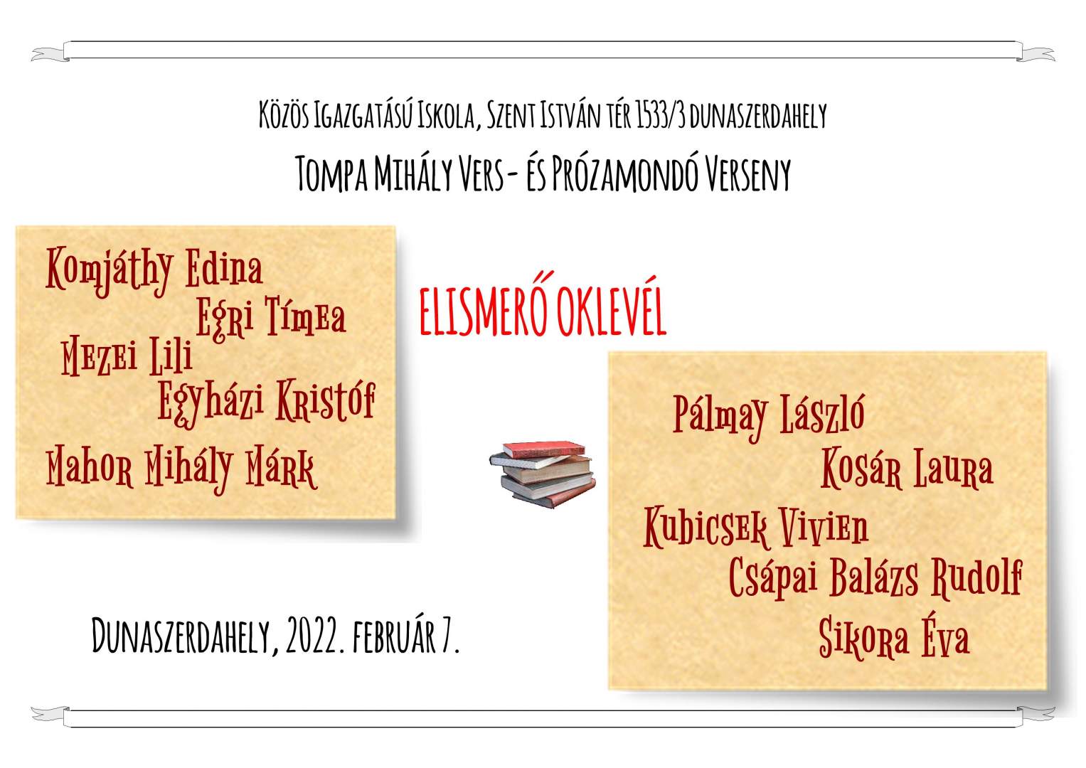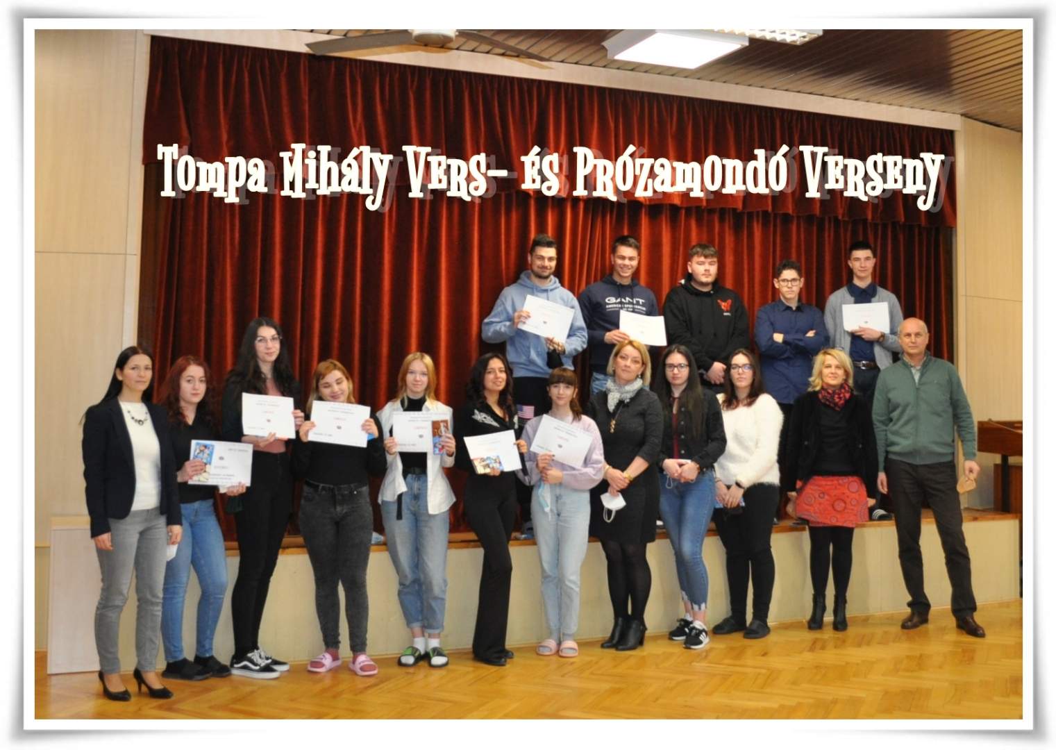 2022. február 7-én került megrendezésre a Tompa Mihály Vers- és Prózamondó Verseny iskolai fordulója. A versenyzők többsége verset mondott, de akadtak olyanok is, akik prózával készültek. A szerzők között akadt klasszikus, kortárs és kisebbségi egyaránt. Az iskola magyartanárai rendkívül örültek, hogy a vészterhes idők ellenére ilyen sok diákot vonzott ez az irodalmi megmérettetés. Iskolánkat a következő tanulók képviselik a járási fordulón:
