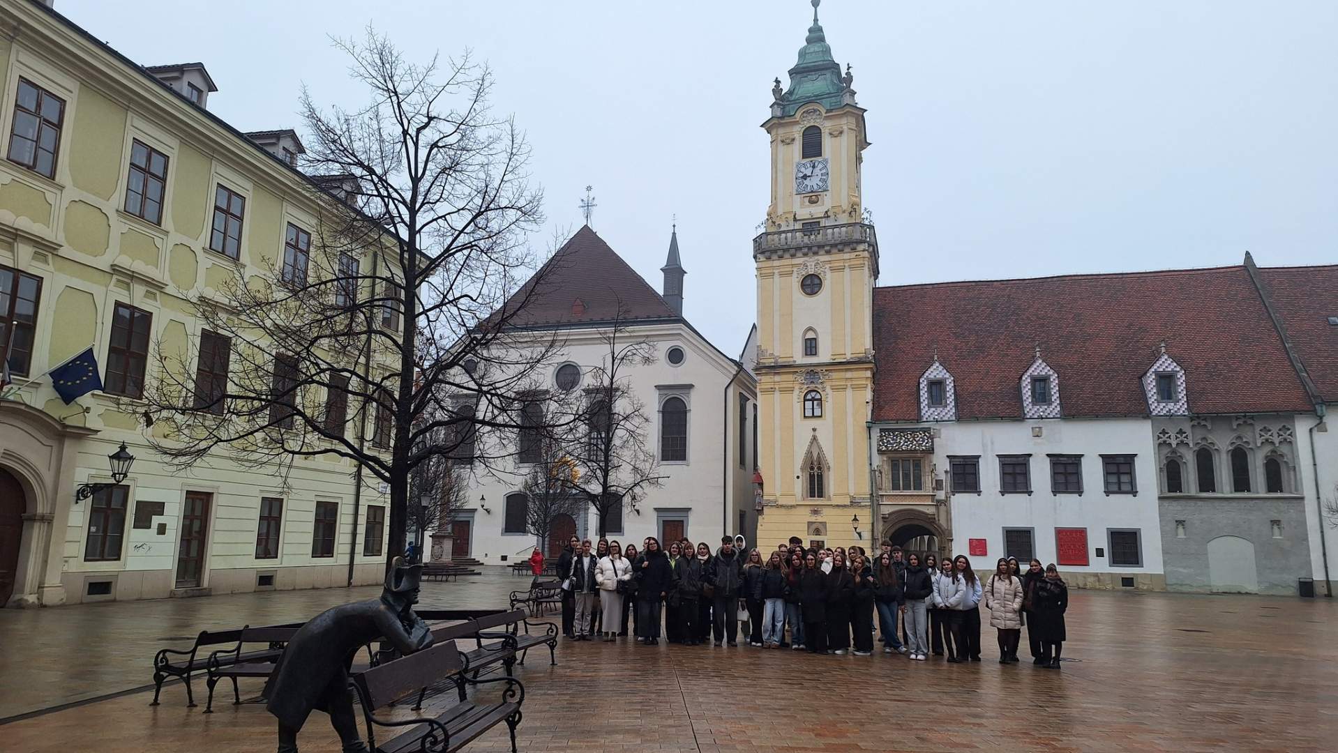 Továbbhaladva a háromnyelvű város múltját idéző Salvator gyógyszertár épülete előtt álltak meg, ahol a homlokzaton ma is együtt olvasható a magyar, a szlovák és a német felirat. A ködbe burkolózó Szent Márton-dóm tornyát ezúttal elfedte a pára, így a csúcsát díszítő korona sem látszott. Útjukat a Hviezdoslav téren folytatták, ahol megálltak a legnagyobb szlovák költő szobránál, végigsétáltak a Szlovák Nemzeti Színház történelmi épülete előtt, és a régi szökőkút peremén elolvasták a magyar feliratot is.