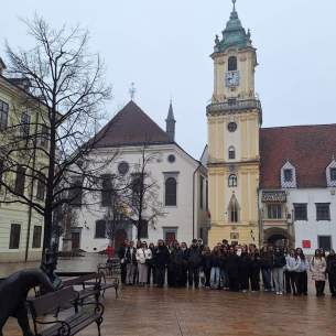 2026.február 12-én az I.B és az I.HA osztály diákjai városnézéssel egybekötött színházlátogatáson vettek részt Pozsonyban. A délelőttöt az Óváros hangulatos utcáin töltötték, ahol sorra felfedezték a történelmi belváros legjelentősebb látnivalóit. Áthaladtak a Mihály-kapu alatt, majd megnézték a magyar országgyűlés egykori épületét. Ezt követően a Roland téren és környékén sétálva a főváros újabb köztéri alkotásait is látták: a francia katonát ábrázoló szobrot, a hölgyeket anno udvariasan köszöntő Schöner Nazit és a szennyvízcsatornából kikandikáló Čumilt.